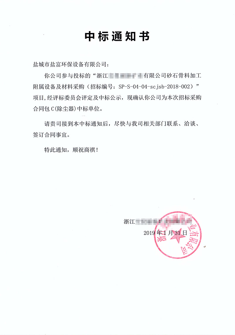 • 一路“標(biāo)”升,鹽富環(huán)保成功中標(biāo)浙江砂石骨料除塵器